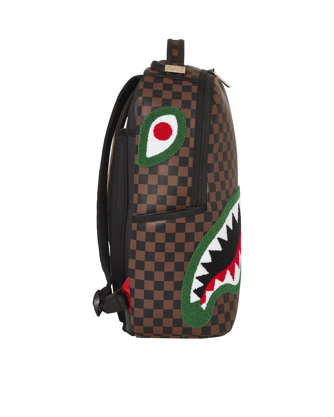 Dimensions: 18" x 6" x 11.5" • Front zipper pocket • Side pockets • Zippered Stash pocket • Separate velour sunglass compartment • Ergonomic mesh back padding • Adjustable Straps for custom sizing • Gold zippers with metal hardware • Metal "Sprayground Authentic" badge • Slide through back sleeve connects to carry-on luggage to free your hands