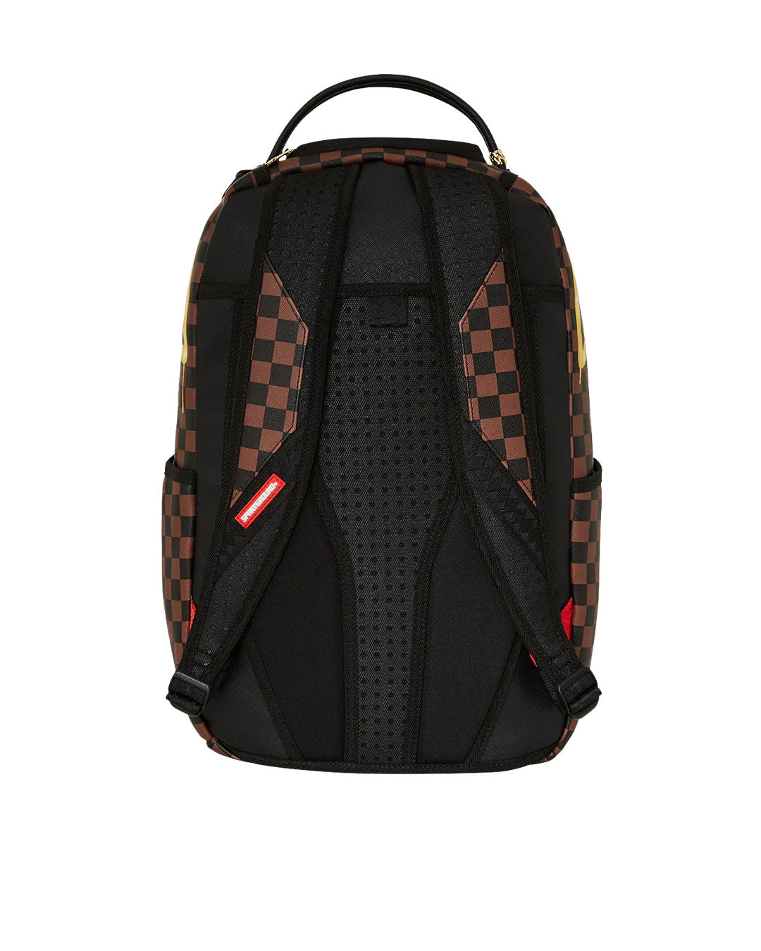Dimensions: 18" x 6" x 11.5" • Front zipper pocket • Side pockets • Zippered Stash pocket • Separate velour sunglass compartment • Ergonomic mesh back padding • Adjustable Straps for custom sizing • Gold zippers with metal hardware • Metal "Sprayground Authentic" badge • Slide through back sleeve connects to carry-on luggage to free your hands