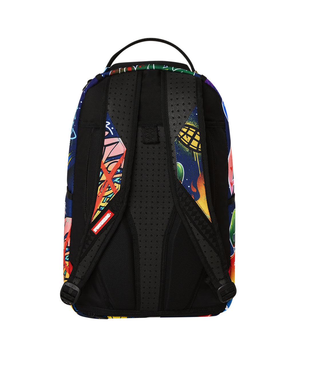 Dimensions: 18" x 6" x 11.5" • Front zipper pocket • Side pockets • Zippered Stash pocket • Separate velour sunglass compartment • Ergonomic mesh back padding • Adjustable Straps for custom sizing • Gold zippers with metal hardware • Metal "Sprayground Authentic" badge • Slide through back sleeve connects to carry-on luggage to free your hands
