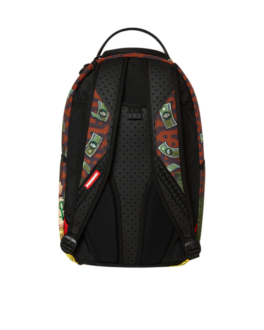 Dimensions: 18" x 6" x 11.5" • Front zipper pocket • Side pockets • Zippered Stash pocket • Separate velour sunglass compartment • Ergonomic mesh back padding • Adjustable Straps for custom sizing • Gold zippers with metal hardware • Metal "Sprayground Authentic" badge • Slide through back sleeve connects to carry-on luggage to free your hands