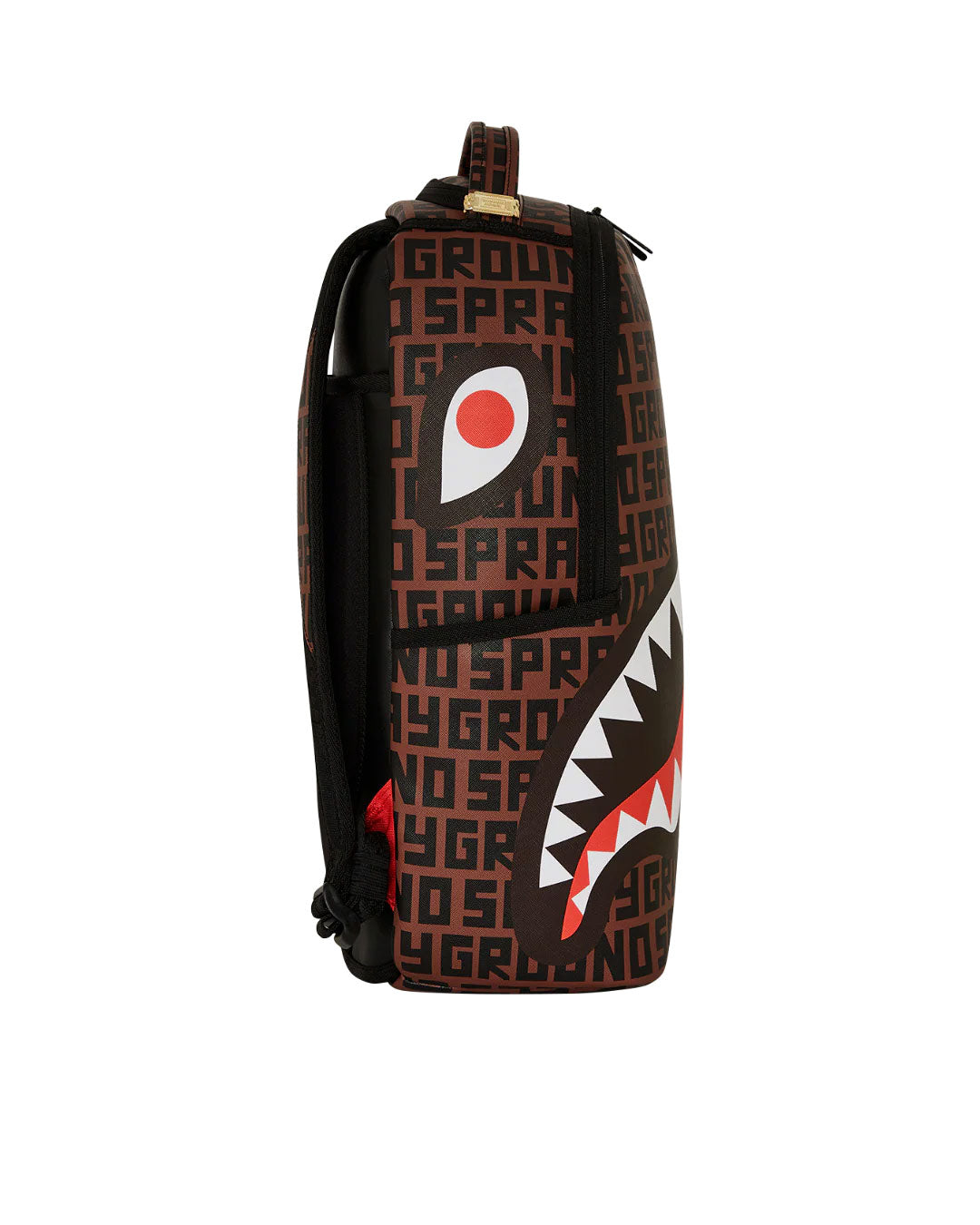Dimensions: 18" x 6" x 11.5" • Front zipper pocket • Side pockets • Zippered Stash pocket • Separate velour sunglass compartment • Ergonomic mesh back padding • Adjustable Straps for custom sizing • Gold zippers with metal hardware • Metal "Sprayground Authentic" badge • Slide through back sleeve connects to carry-on luggage to free your hands