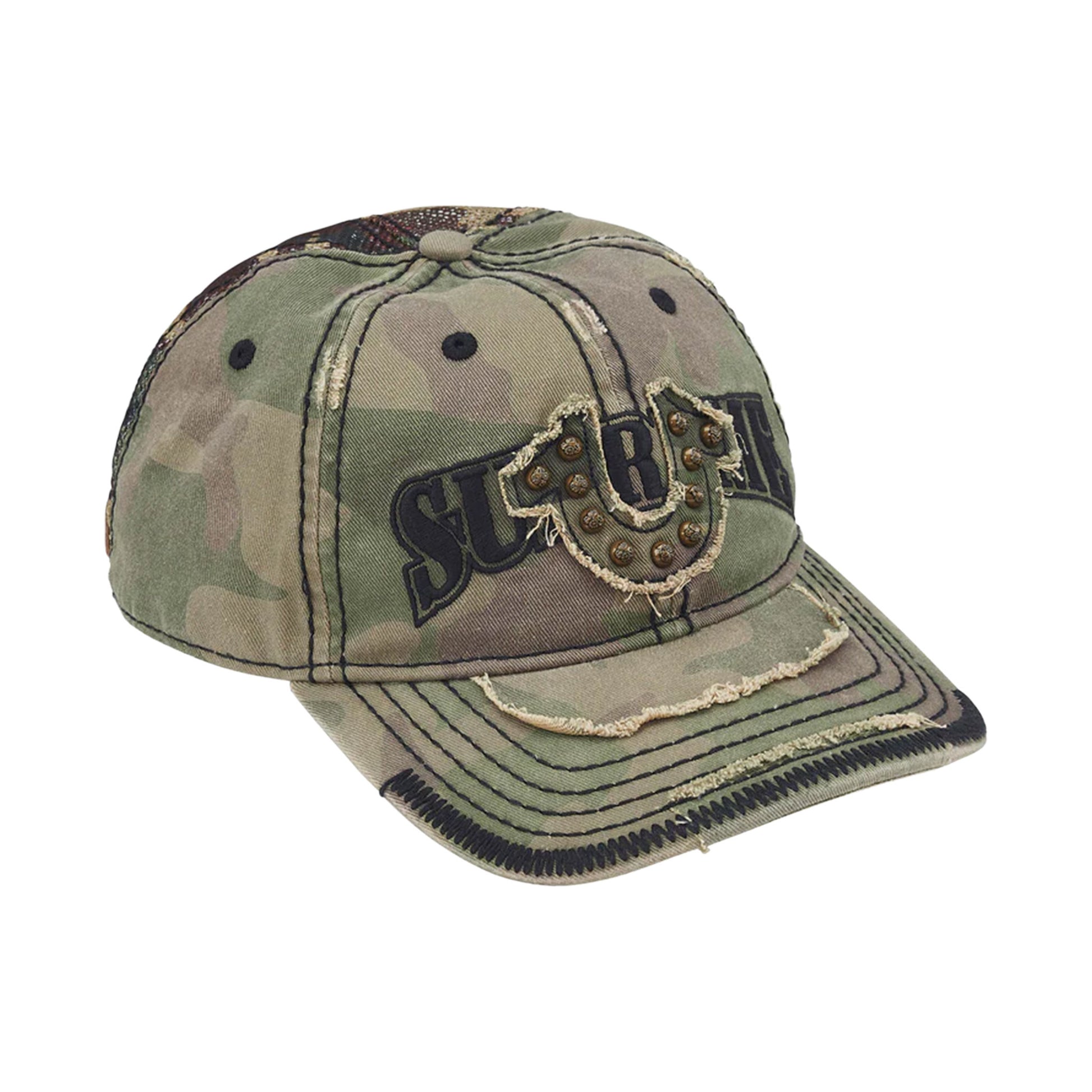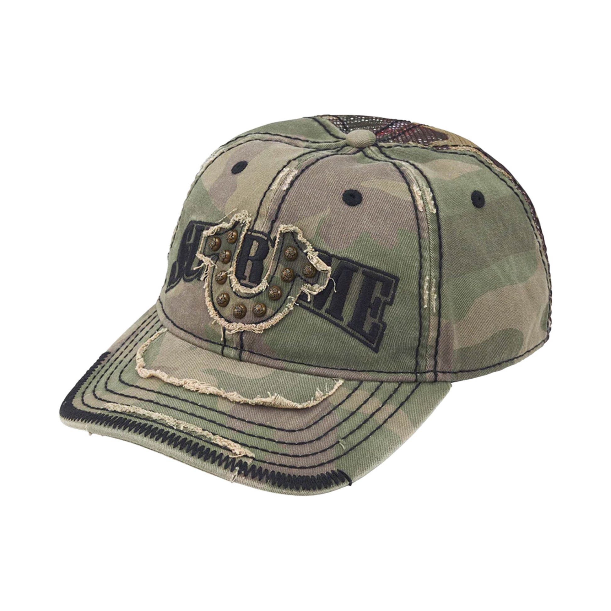 Distressed cotton 12 oz. denim 6-Panel hat with Big T stitch, mesh back and leather strap closure. Logo appliqué with metal studs and embroidered logo at front. Made exclusively for Supreme.