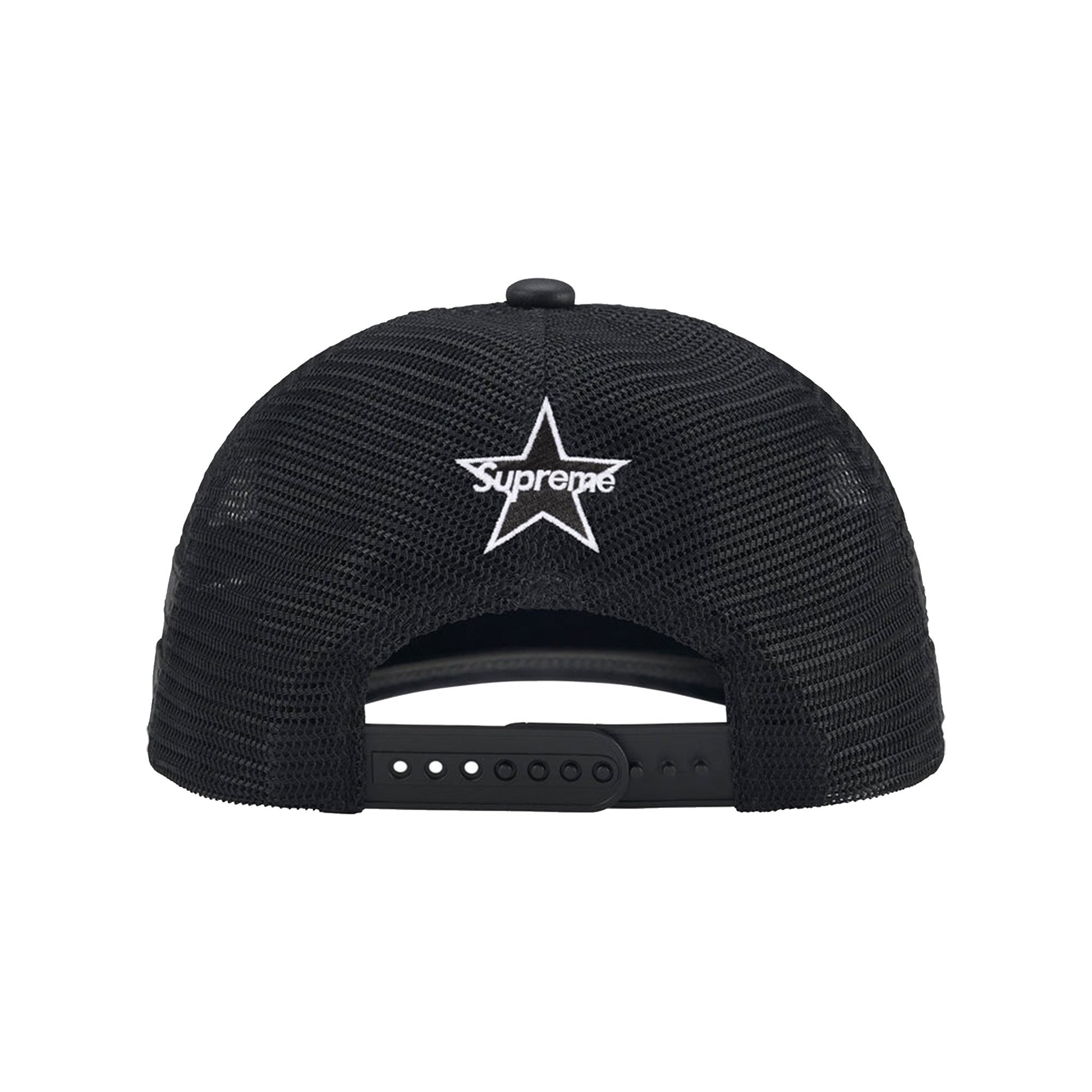 Cowhide leather 6-Panel hat with mesh back and snap closure. Twill logo patch on front and embroidered logo on back.